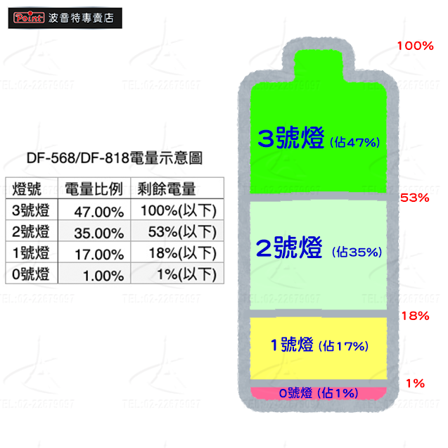 波音特的重要專利為安全的充電控制系統,其中四段式指示燈前三個燈是綠色(3、2、1),沒電時就會亮第四個紅燈0。以DF-568或DF-818為例,亮3號燈是代表完全飽電,亮2號燈是指大約還有18~53%電量,亮1號燈約剩18%以下,此時就要趕快充電,如此可大大延長電池壽命。